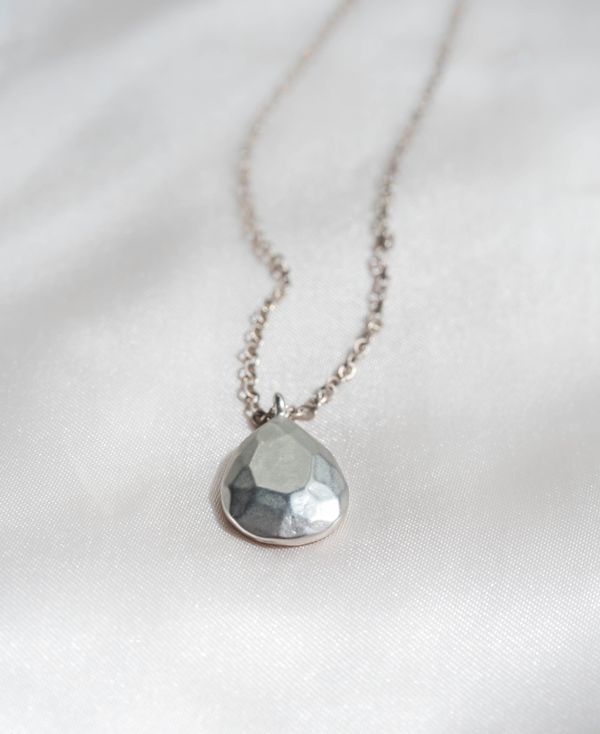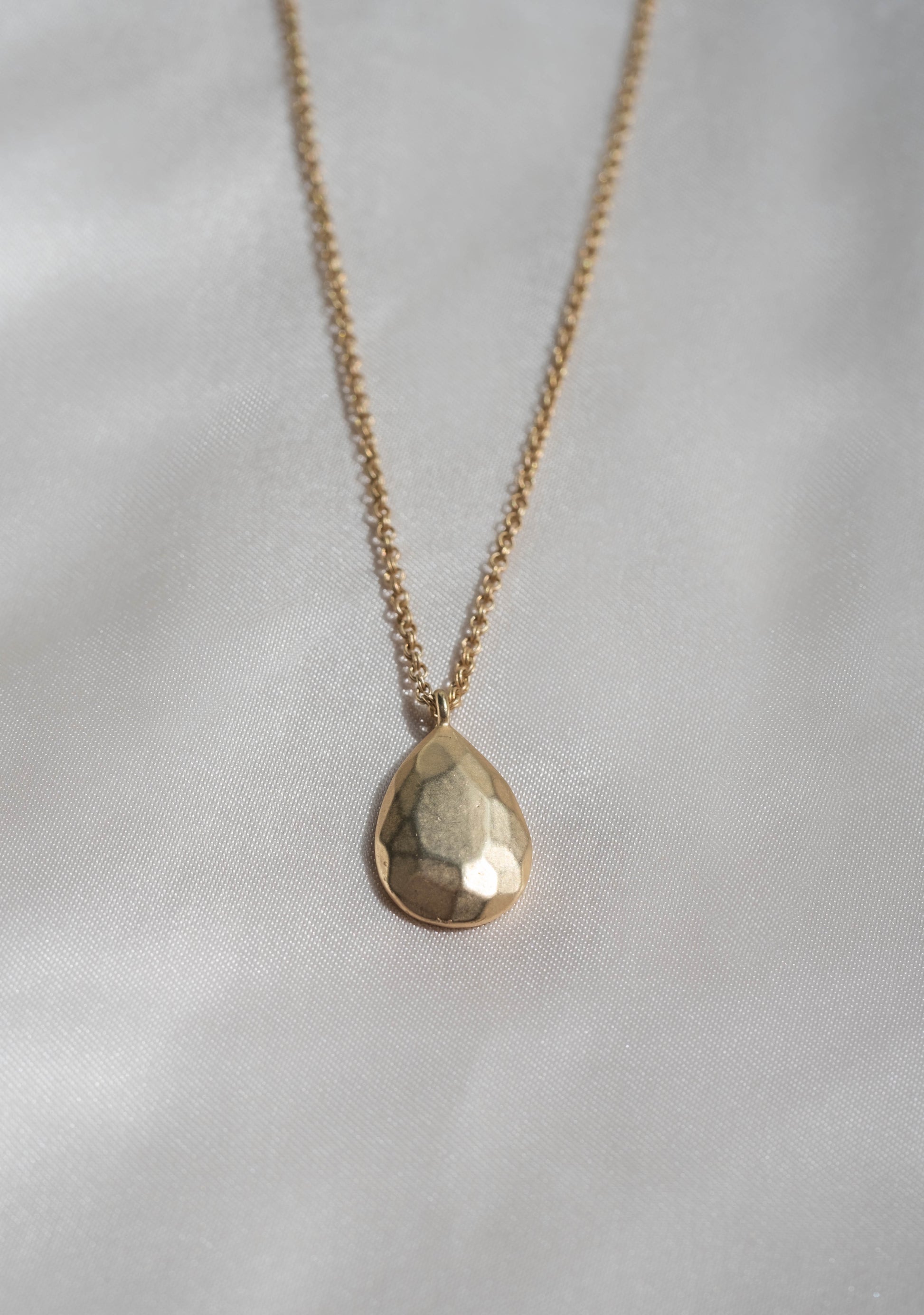 Faceted dew drop pendant hangs on approximately 20 inches of chain. Pick between gold or silver.